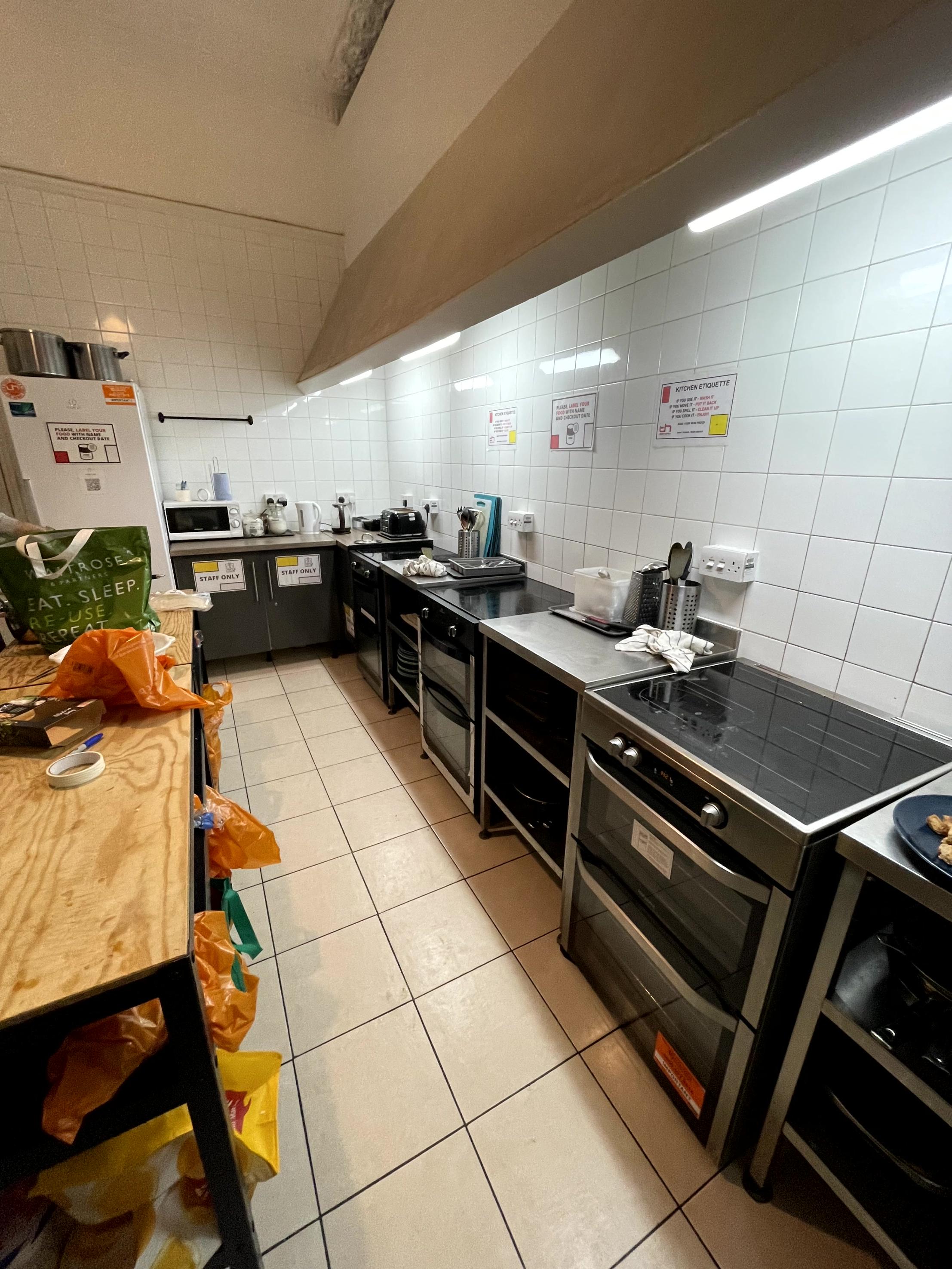 제가 런던에 갔을때는 이미 제 여행이 중반에 접어든 시점이라, 어바니 호스텔 런던에 오기 전까지 꽤 많은 숙소를 거쳐왔습니다. 그런데요, 공용 주방이 있는 호스텔 중 냉장고와 식기류, 쓰레기 관리가 이렇게 엉망인 곳은 이곳이 처음이었습니다. 그리고 주방에서 음식을 만들어 의자와 테이블이 있는 별도의 공용 공간으로 가야 하는데, 그 공간 역시 좁고 환기가 안 되는 구조인지라 많은 분들이 주방에서 음식을 만들며 그 자리에 서서 식사를 했습니다. 앞에 한두 팀이 음식을 만드느라 자리를 차지하면, 저는 그 팀의 작업이 끝날 때까지 한쪽에 서서 기다려야 하는 구조입니다. 사진으로는 넓고 깨끗한 척을 하고 있지만 휴, 아니에요. 제가 찍은 사진이지만...... 속지 마세요. 이거 다 아이폰빨이에요.